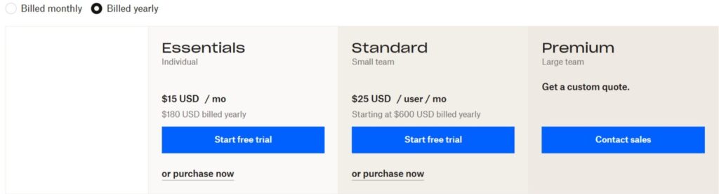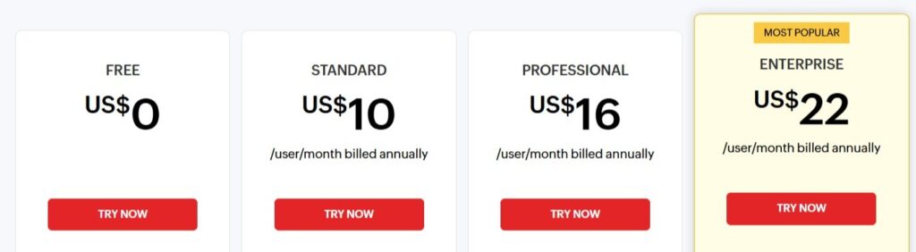 *Note: UK pricing shown. US pricing typically starts at $10/user/month for Standard.*