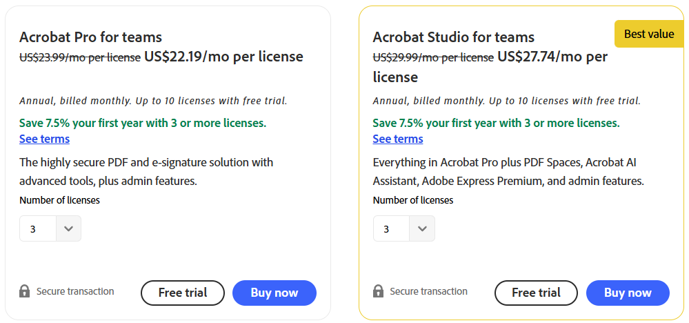 | Acrobat Studio for Teams | Full document AI suite | $27.74/user/month ($332.88/year) | All Pro features + AI Assistant, Adobe Express, PDF Spaces |