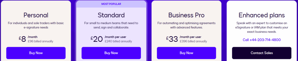 | Standard | Small-medium teams | Β£20/user/month (Β£240/year) | Send, sign, collaborate, team features |