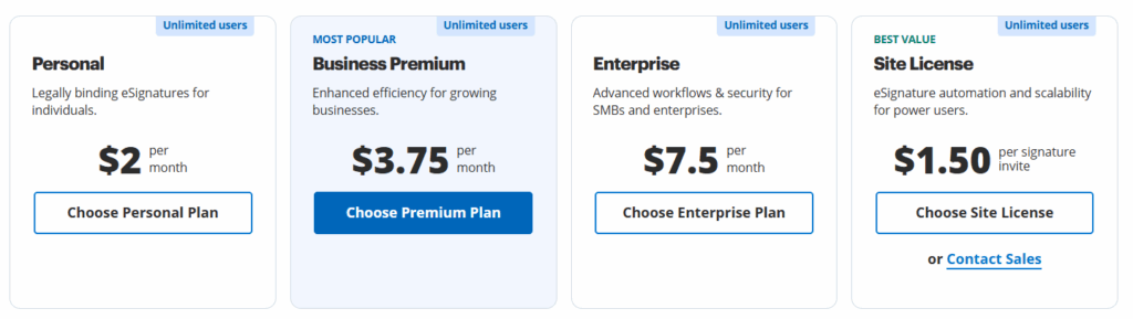 | Personal | Individuals | $2/month | Basic eSignatures, unlimited users |